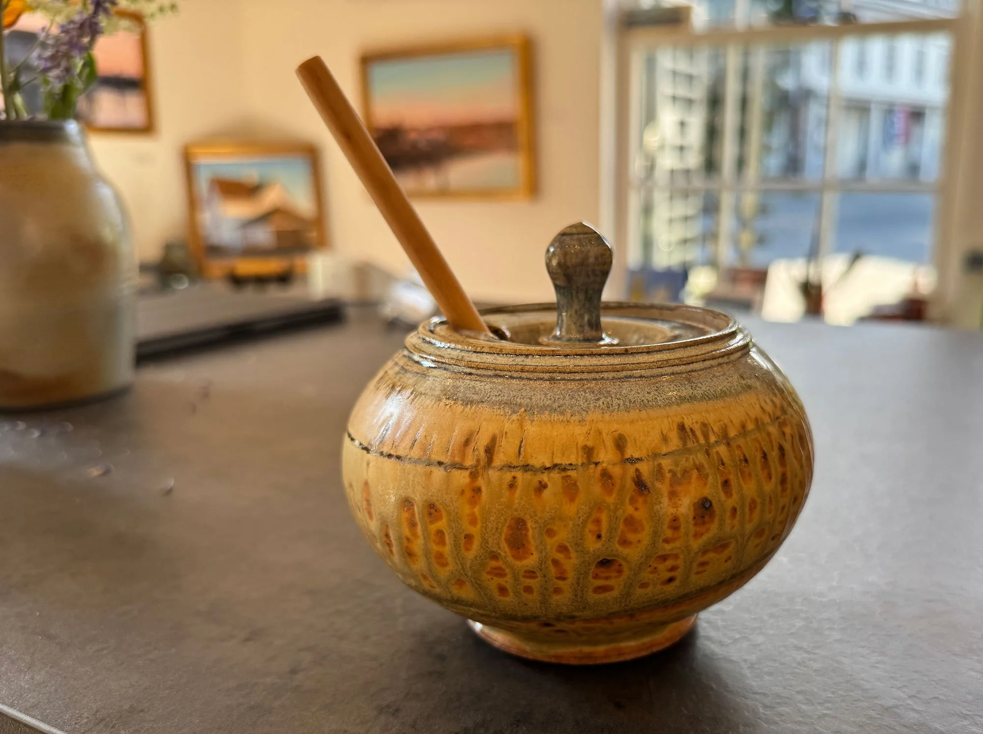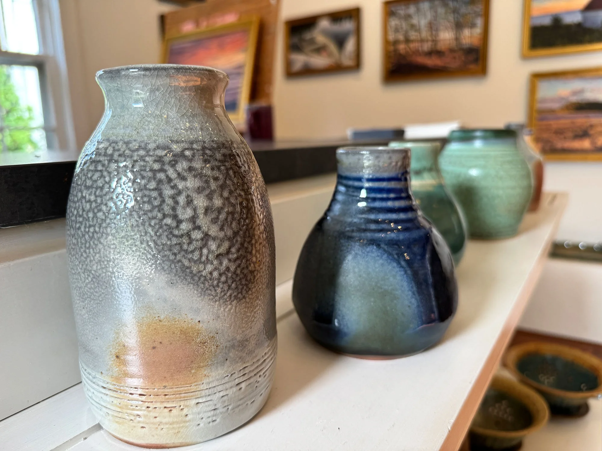 Hand-crafted pottery by Anne Suggs, Mark & Huynh Mai Fitzgerald, and Chris Smith can be viewed at the gallery.